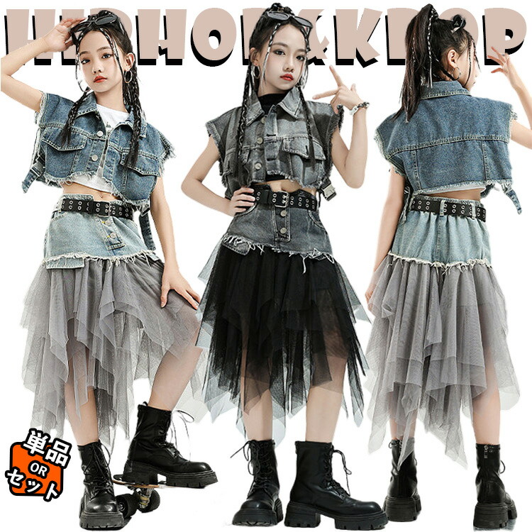 キッズ ダンス衣装 セットアップ デニム ベスト スカートセット おしゃれ ファッション チア 女の子 チアガール 韓国 k-pop グレー ブルー テイアードスカート ベルト ヒップホップ