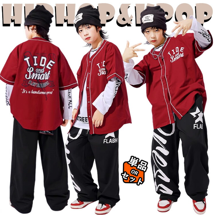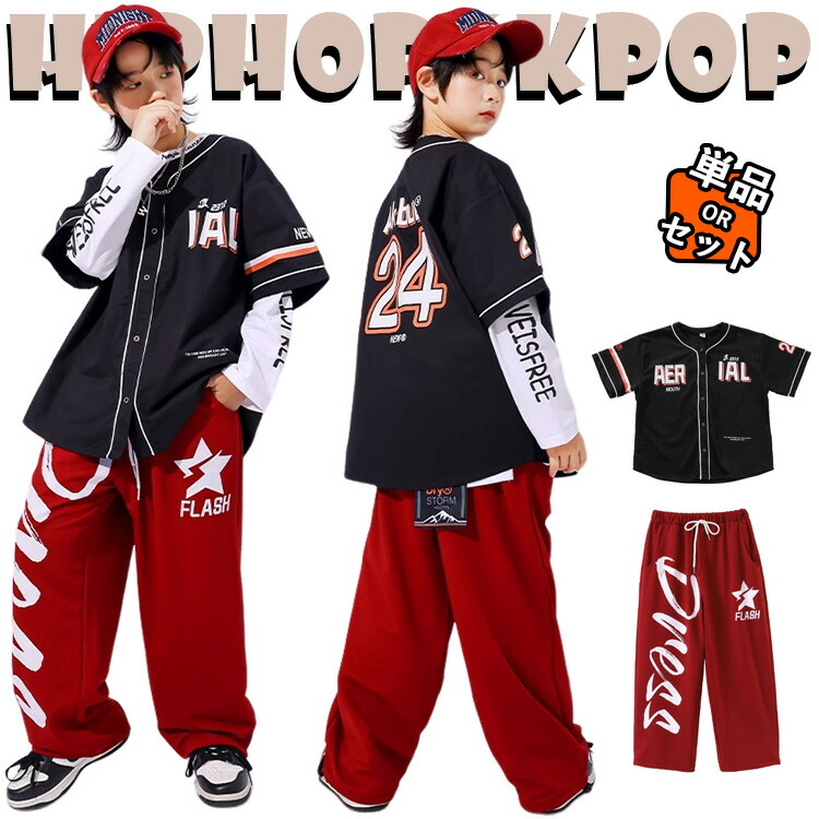 黒色 レッド ベースボールシャツ キッズ ダンス衣装 半袖 セットアップ 女の子 男の子 子供 シャツ トップス サルエルパンツ ヒップホップ ジャズダンス 演出服 練習着 団体服 応援