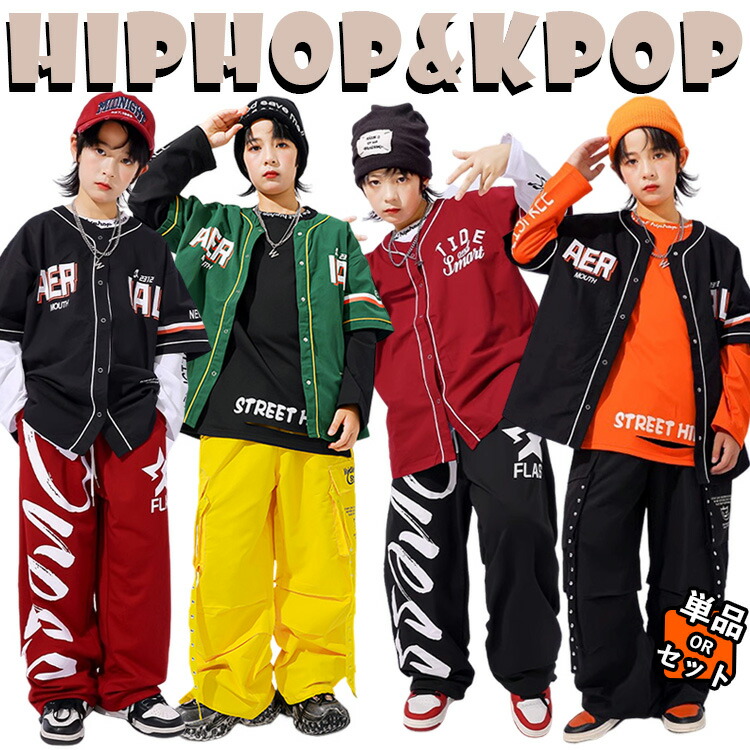 緑 黄 黒 レッド ベースボールシャツ キッズ ダンス衣装 半袖 セットアップ 女の子 男の子 子供 シャツ トップス サルエルパンツ カーゴパンツ ヒップホップ 演出服 練習着 団体服
