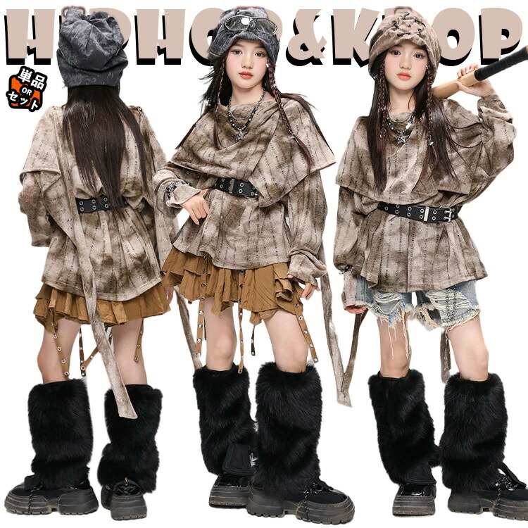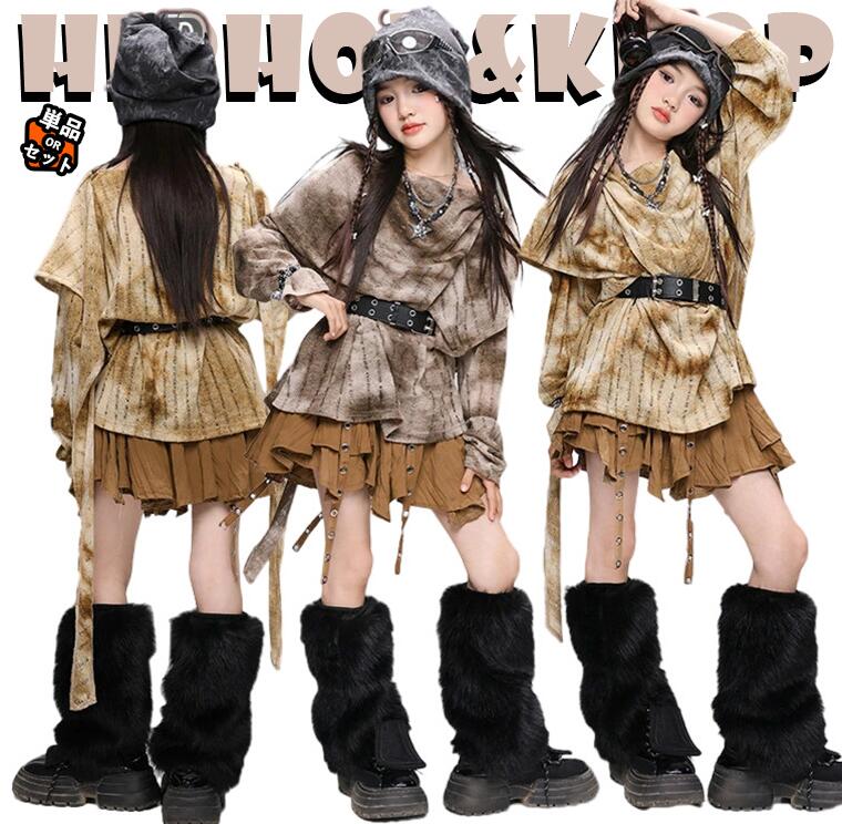 ブラウン シャツ ゆったり キッズ ダンス衣装 女の子 長袖 脚カバー トップス スカート 上下セット セットアップ カジュアル かっこいい ダンスウェア ヒップホップ ジャズダンス ポ