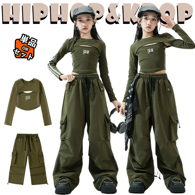 カーキグリーン トップス カーゴパンツ キッズ ダンス衣装 セットアップ 韓国 上下セット おしゃれ 女の子 かっこいい かわいい 長袖 へそ出し タンクトップ ダンスウエア ヒッ