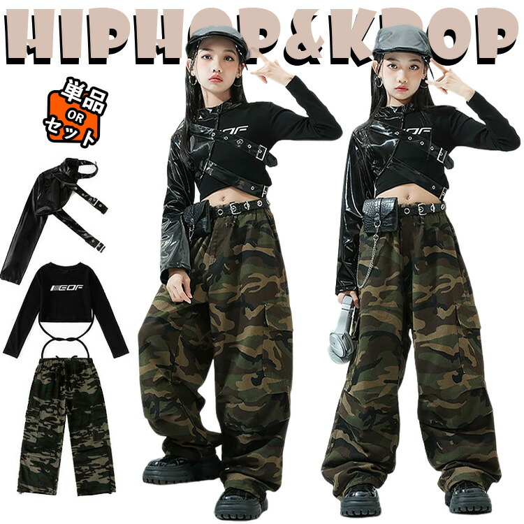 韓国 jazz レザー トップス 迷彩 カーゴパンツ 黒 Tシャツ キッズ ダンス衣装 セットアップ 上下セット おしゃれ 女の子 かっこいい かわいい 長袖 へそ出し カジュアル ダンスウエア