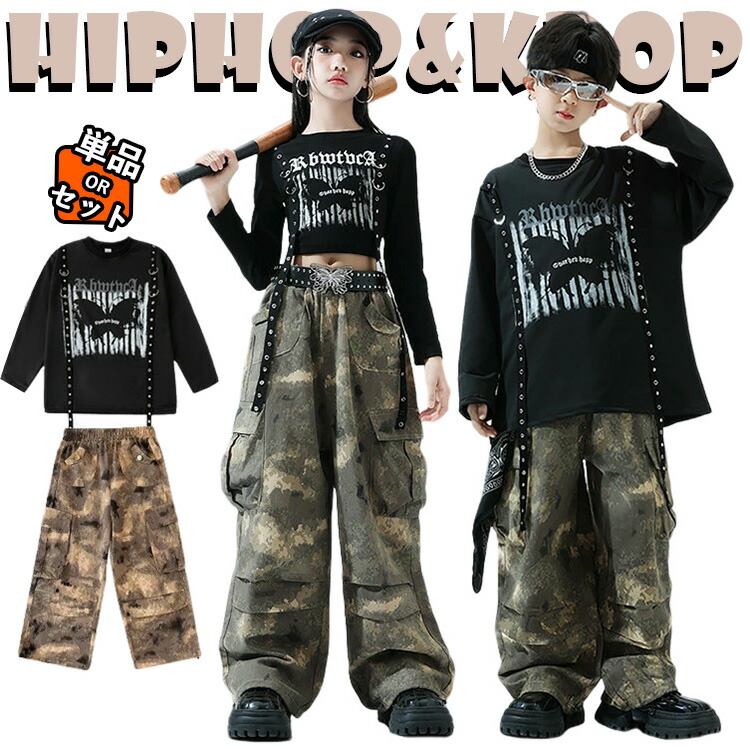 キッズ ダンス衣装 ブラック トップス 迷彩 カーゴパンツ セットアップ 上下セット おしゃれ 女の子 男の子 かっこいい かわいい カジュアル 長袖 ゆったり ダンスウエア ヒップホッ