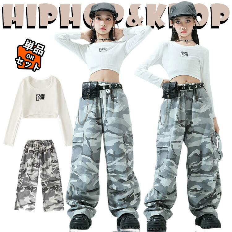 韓国 jazz 迷彩 カーゴパンツ ホワイト 長袖 トップス ベルト バッグ キッズ ダンス衣装 セットアップ 上下セット おしゃれ 女の子 かっこいい かわいい へそ出し ダンスウエア ヒッ