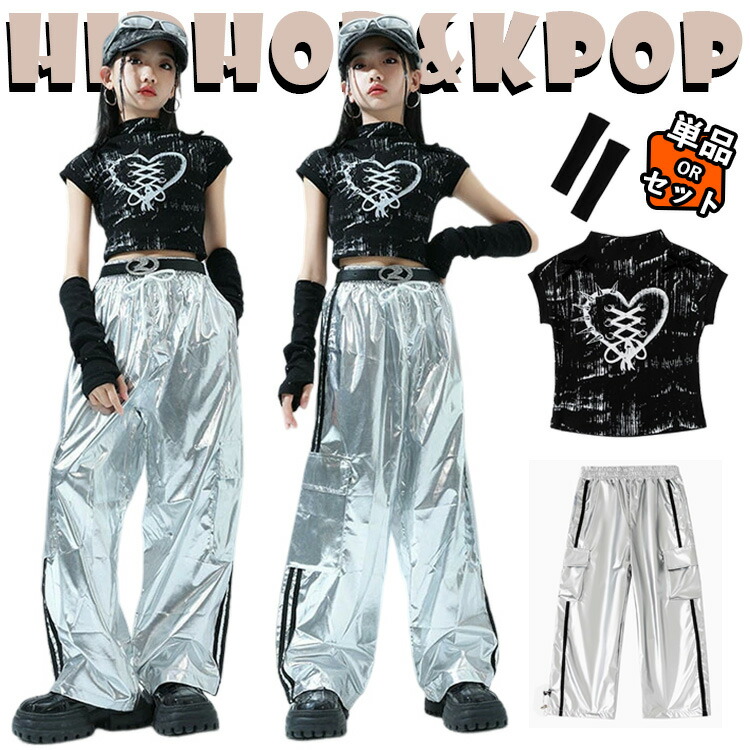 キッズ ダンス衣装 黒 トップス 腕カバー シルバー カーゴパンツ セットアップ 上下セット おしゃれ 韓国 jazz 女の子 かっこいい かわいい 半袖 へそ出し レザーパンツ ダンスウエア