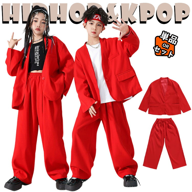レッド パンツスーツ フォーマル スーツ ジャケット カジュアルパンツ セットアップ キッズ ダンス衣装 上下セット おしゃれ 女の子 男の子 かっこいい かわいい 長袖 ダンスウエア