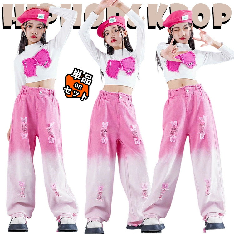 白 長袖 Tシャツ ピンク デニムパンツ ダメージ加工 キッズ ダンス衣装 個性派 派手 セットアップ 上下セット 韓国 jazz おしゃれ 女の子 かっこいい かわいい へそ出し トップス ダ