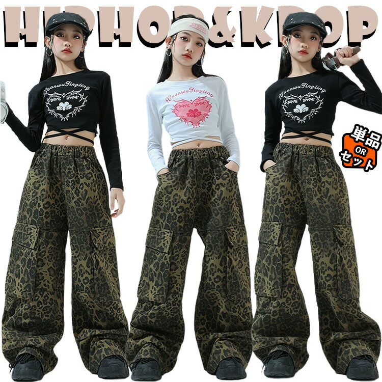 韓国 jazz 黒 白 長袖 Tシャツ 豹柄 カーゴパンツ キッズ ダンス衣装 セットアップ 上下セット おしゃれ 女の子 かっこいい かわいい へそ出し トップス ウェストパンツ ダンスウエア