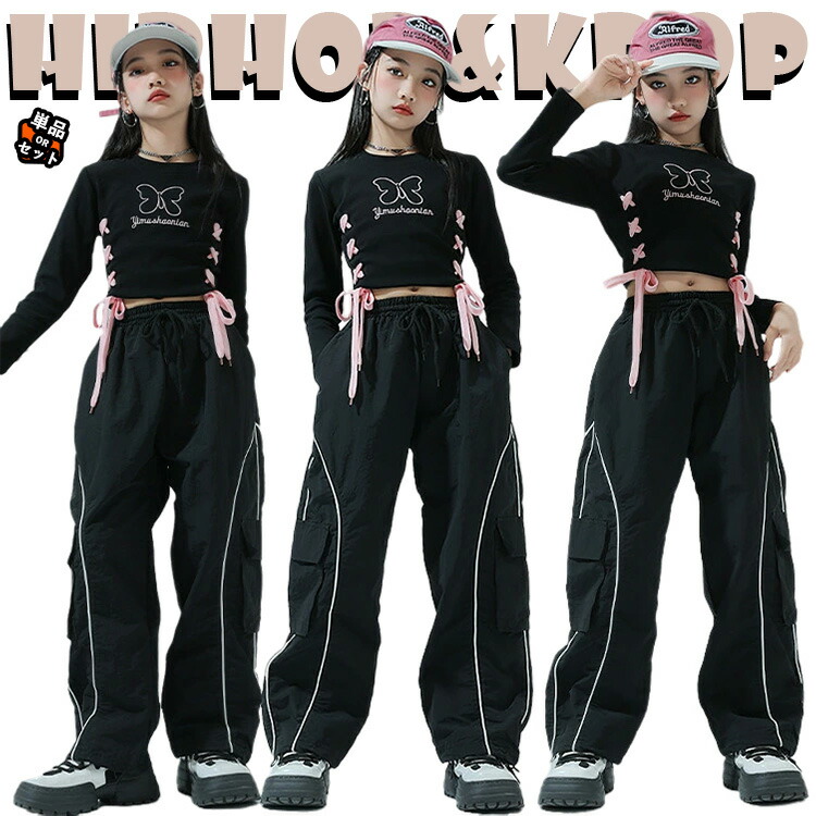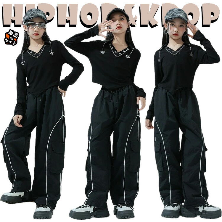 ブラック 長袖 シャツ ウェストパンツ キッズ ダンス衣装 セットアップ 上下セット 韓国 おしゃれ 女の子 かっこいい かわいい へそ出し トップス カーゴパンツ ダンスウエア