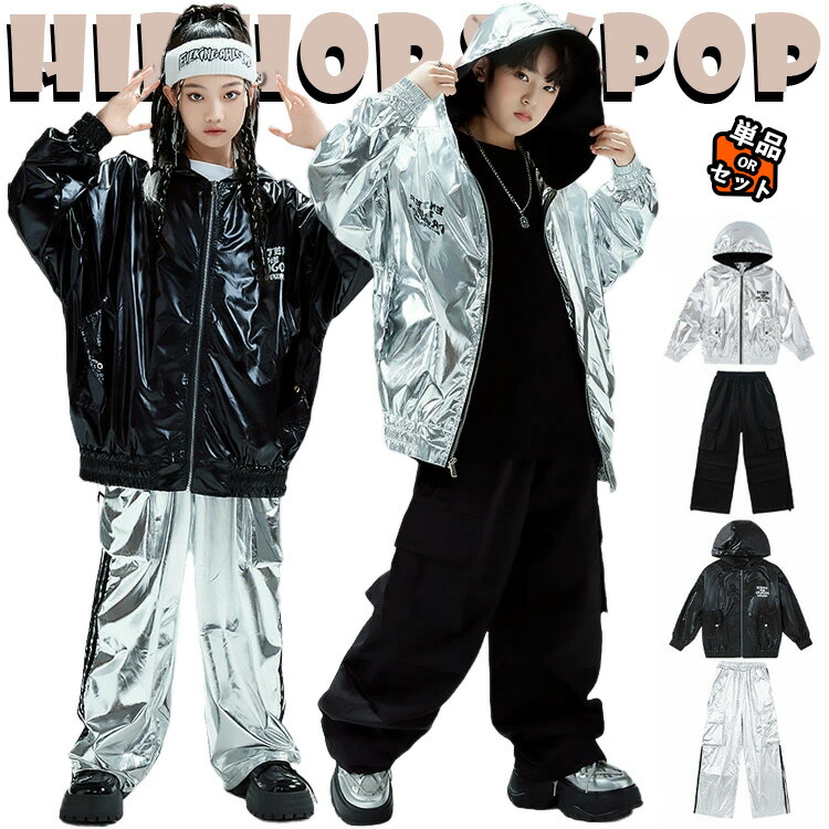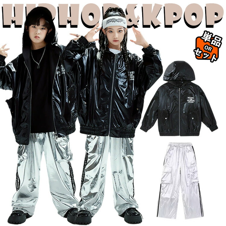 2色 キッズ ダンス衣装 セットアップ 黒色 シルバー 反射柄 レザー フードジャケット 女の子 男の子 ファッション 長袖 スタジャン ジャケット ダンスウェア トップス カーゴパンツ