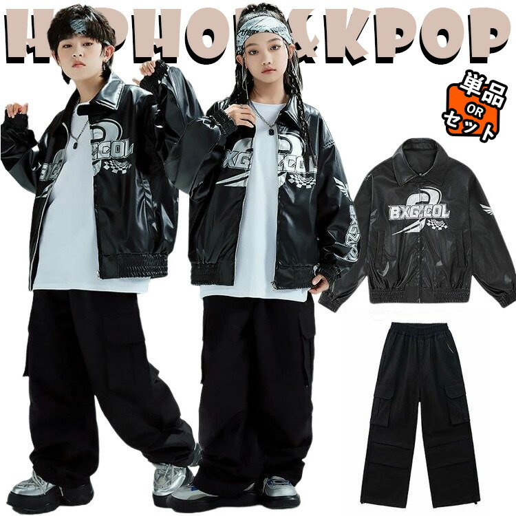 黒色 レザー フードジャケット キッズ ダンス衣装 セットアップ 女の子 男の子 ファッション ユニセックス衣装 長袖 スタジャン ジャケット ダンスウェア トップス カーゴパンツ ジャ