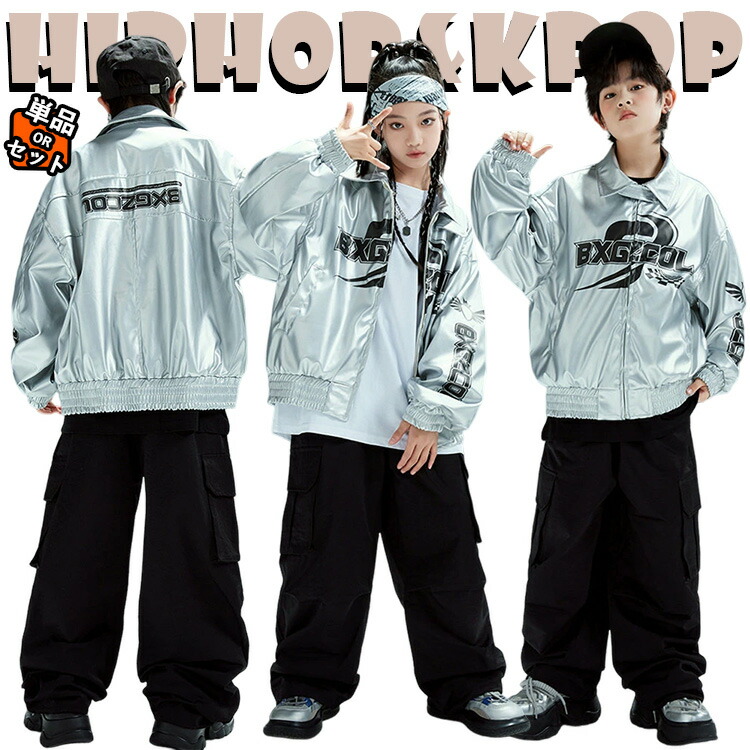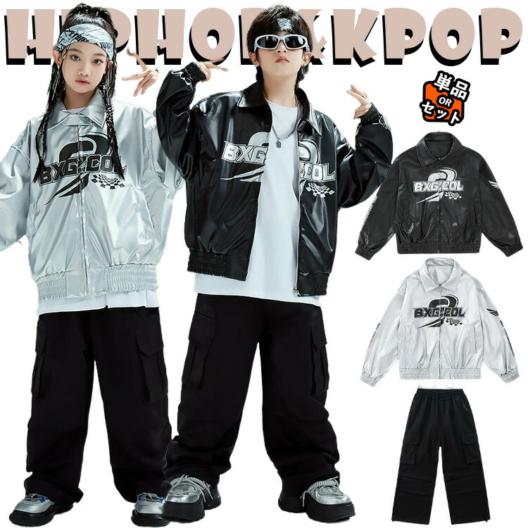 シルバー スタジャン レザー ジャケット キッズ ダンス衣装 セットアップ 女の子 男の子 長袖 カジュアル ゆったり トップス カーゴパンツ サルエルパンツ 韓国 - ヒップ