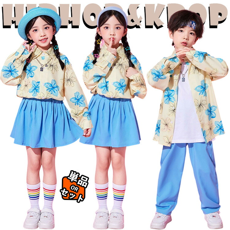 柄シャツ ブルー スカート ウェストパンツ チア チアガール キッズ ダンス衣装 セットアップ 上下セット おしゃれ 女の子 男の子 かっこいい かわいい カジュアル 長袖 ダンスウエア