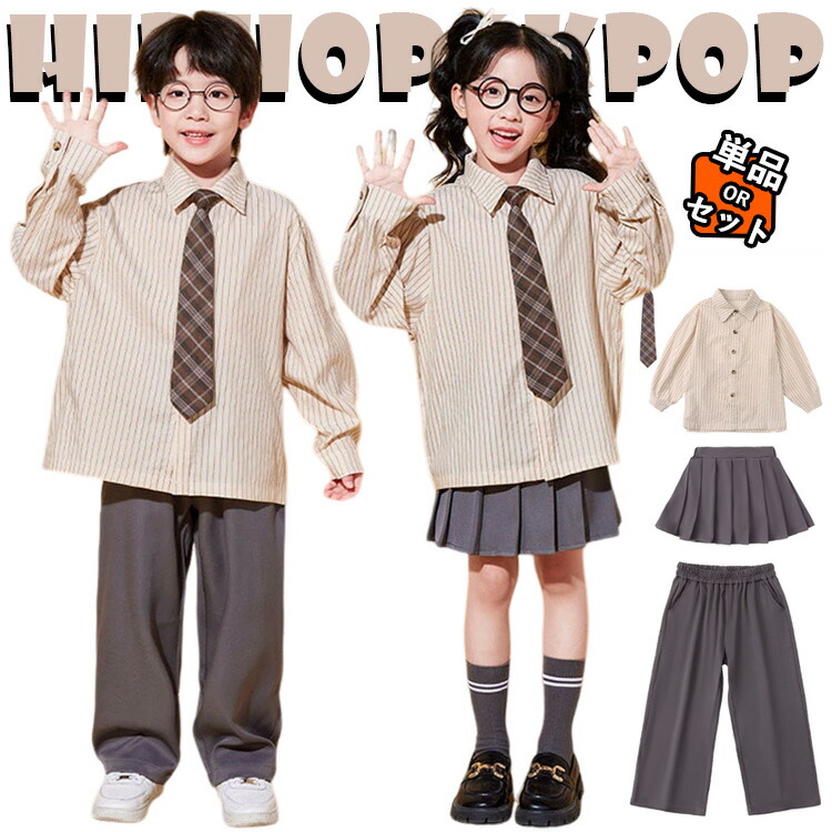 チア チアガール ストライプ柄 シャツ グレー スカート ウェストパンツ キッズ ダンス衣装 セットアップ 上下セット おしゃれ 女の子 男の子 かっこいい かわいい 長袖 ダンスウエア