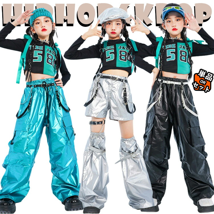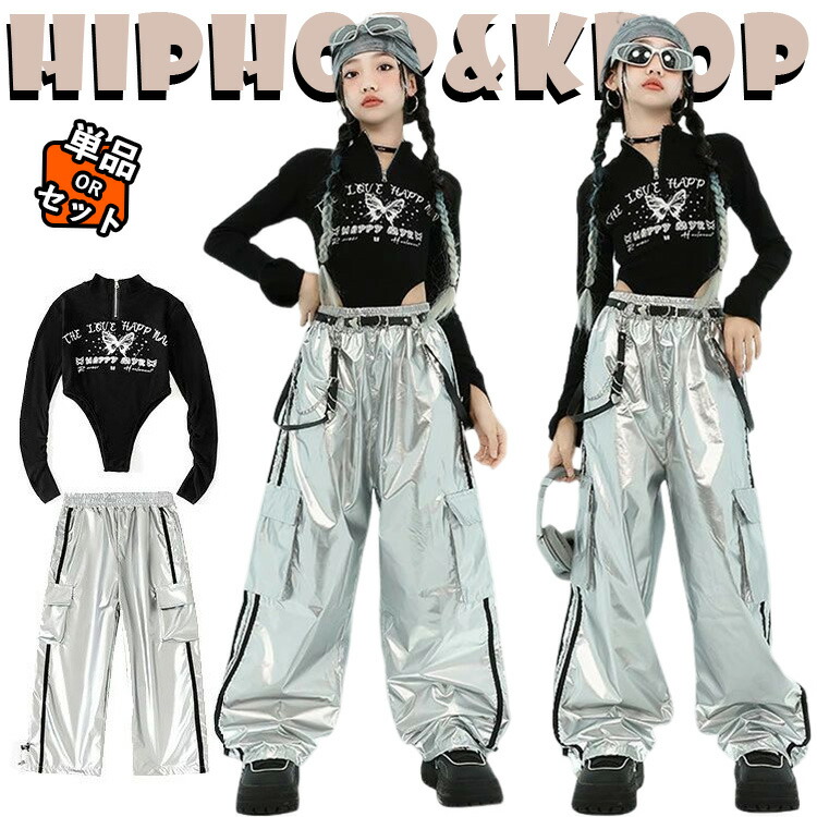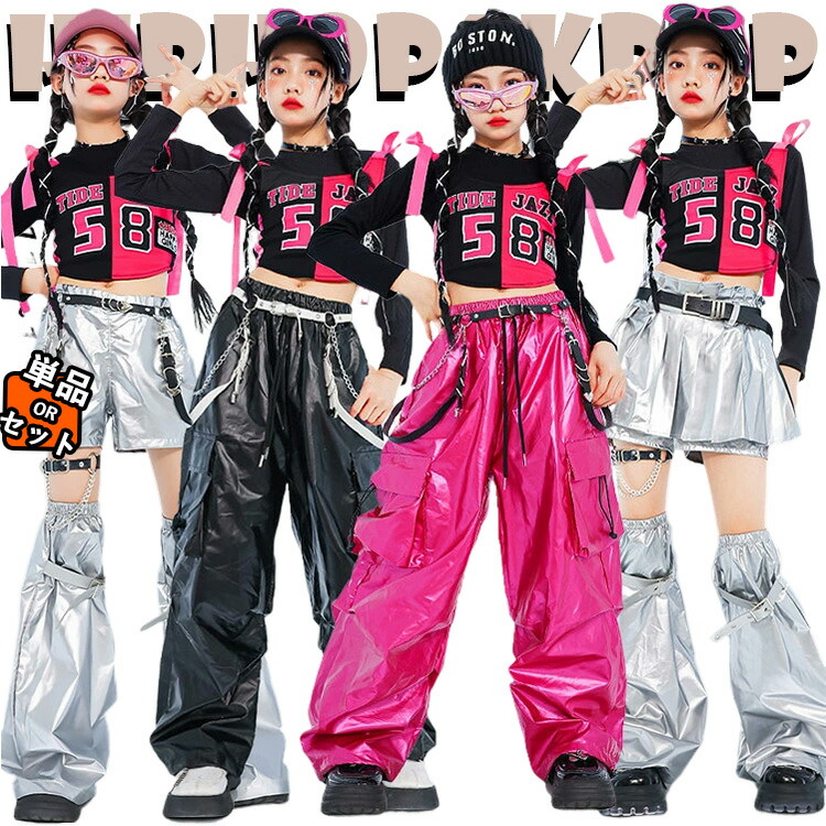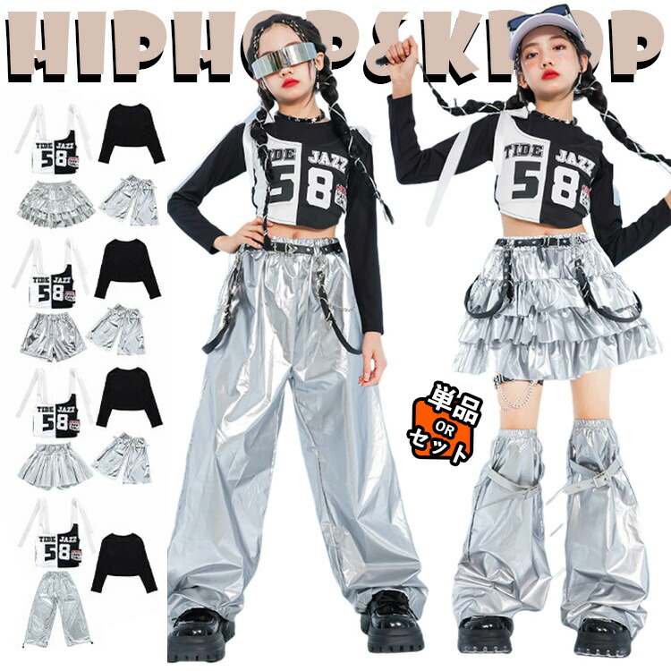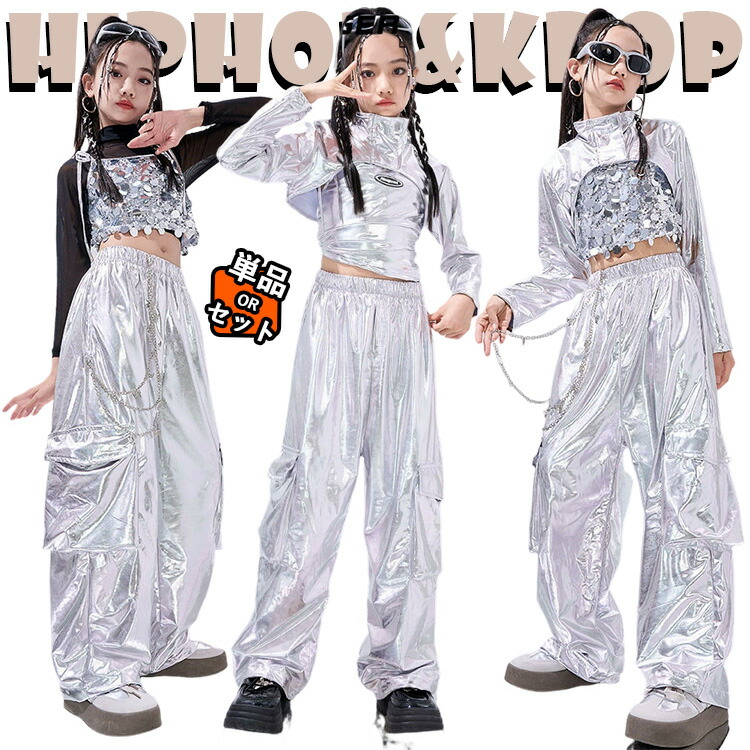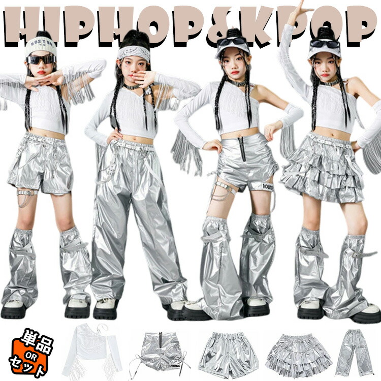 銀色 チア 女の子 チアガール 韓国 k-pop キッズ ダンス衣装 セットアップ ライナー へそ出し トップス ファッション シルバー カーゴパンツ プリーツ スカート テイアードスカート