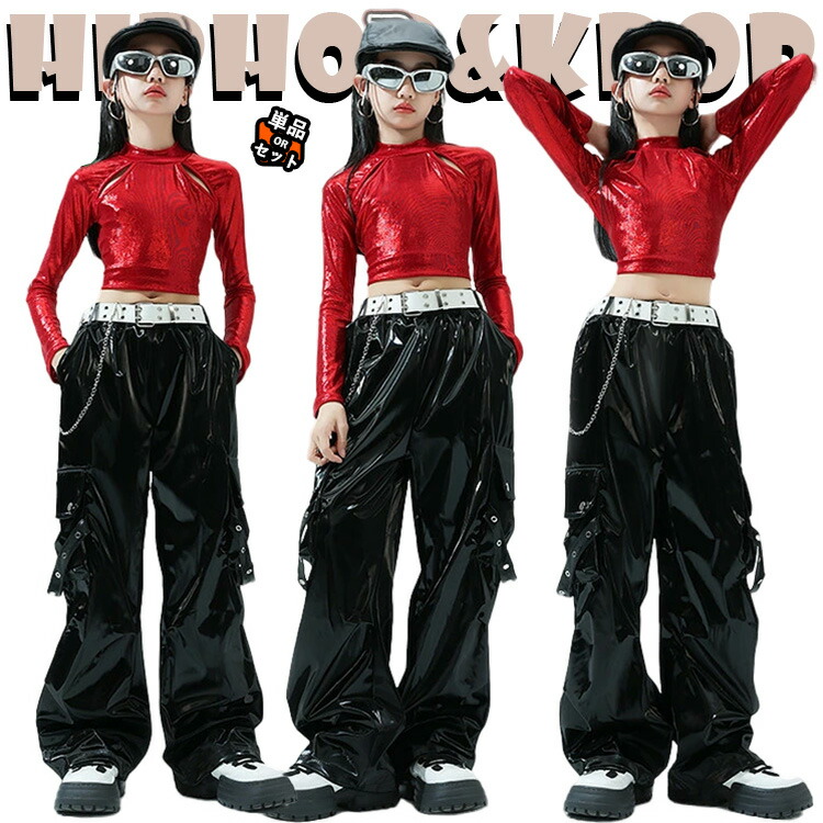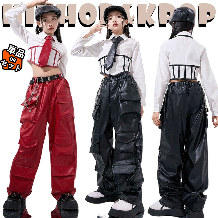 キッズ ダンス衣装 シャツ 黒 赤 レザーパンツ ネクタイ セットアップ 上下セット 韓国 おしゃれ 女の子 かっこいい かわいい 長袖 へそ出し ダンスウエア カーゴパンツ ヒップ