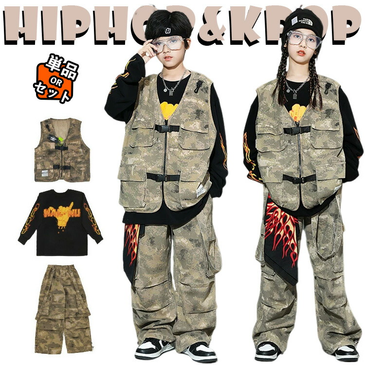 キッズ ダンス衣装 迷彩 ベスト ブラウン カーゴパンツ 黒 トップス セットアップ 上下セット おしゃれ 女の子 男の子 かっこいい かわいい カジュアル 長袖 ダンスウエア ヒップホッ
