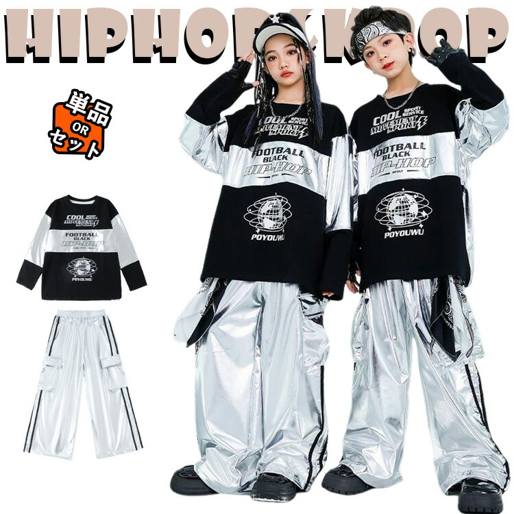 レーシング風 黒 トップス シルバー レザーパンツ キッズ ダンス衣装 セットアップ 上下セット おしゃれ 女の子 男の子 かっこいい かわいい カーゴパンツ ダンスウエア ヒップホップ