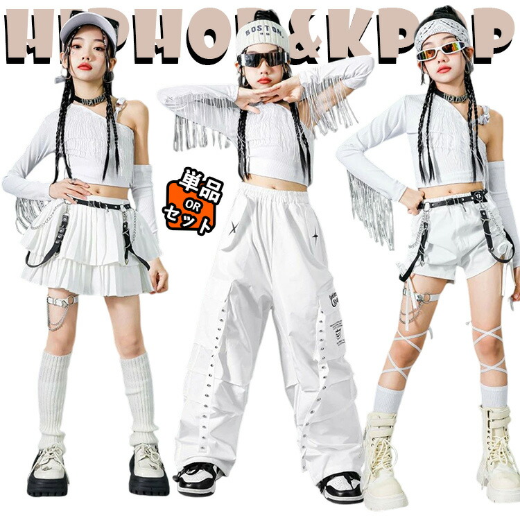 白色 チア 女の子 チアガール 韓国 k-pop キッズ ダンス衣装 セットアップ ライナー へそ出し トップス ファッション カーゴパンツ サルエルパンツ プリーツ スカート テイアードスカ