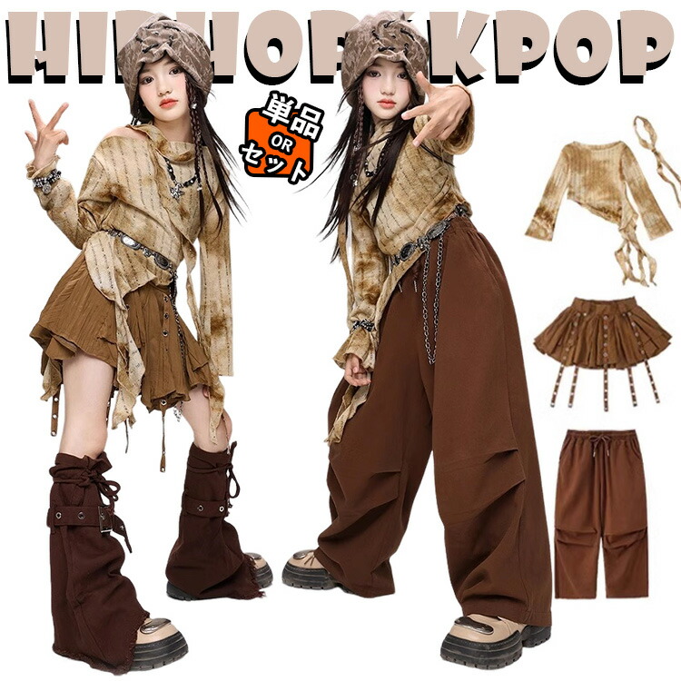 ブラウン ゆったり キッズ ダンス衣装 女の子 Tシャツ 長袖 脚カバー トップス スカート カーゴパンツ セットアップ カジュアル かっこいい ダンスウェア ヒップホップ ジャズダンス