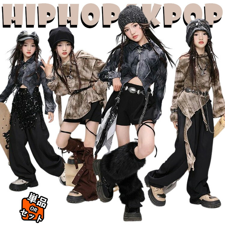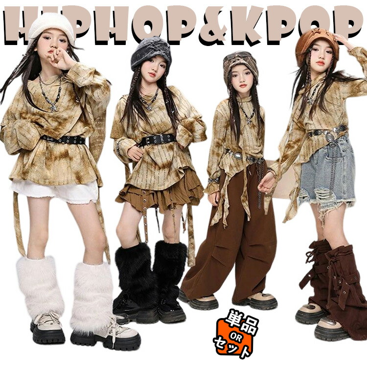 ブラウン ゆったり キッズ ダンス衣装 女の子 シャツ 長袖 脚カバー トップス スカート カーゴパンツ セットアップ カジュアル かっこいい ダンスウェア ヒップホップ ジャズダンス