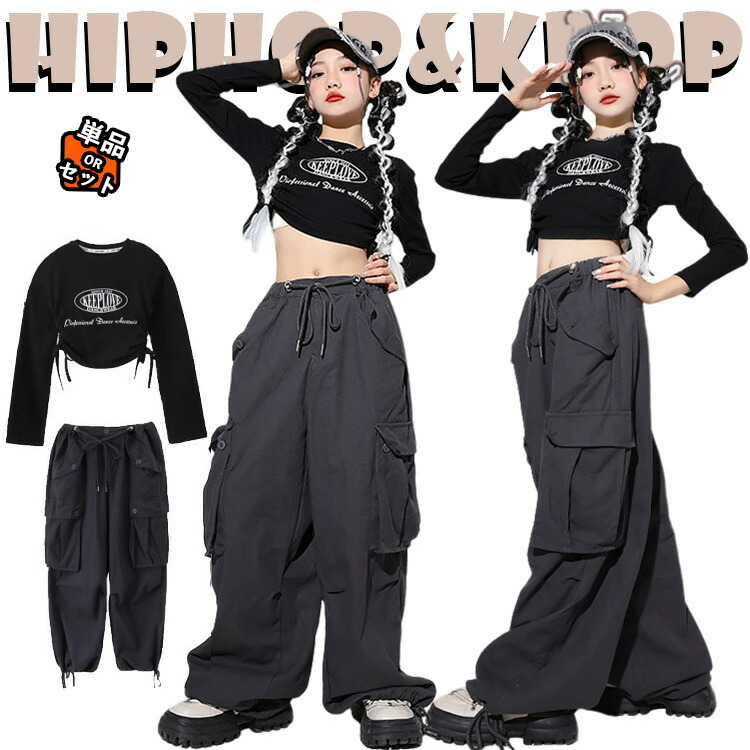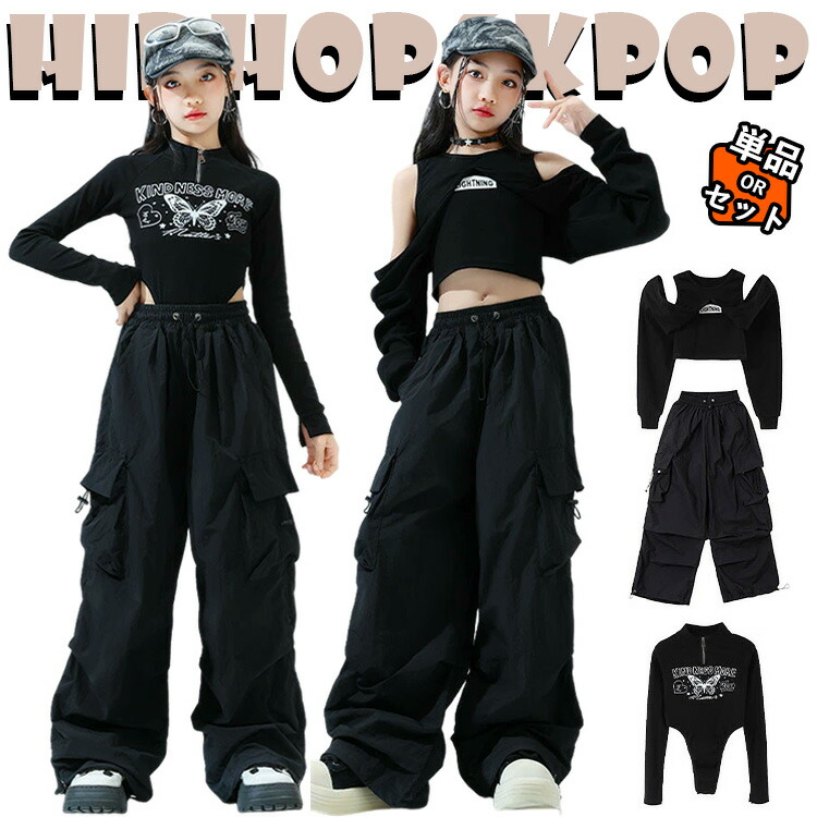 ブラック シャツ カーゴパンツ キッズ ダンス衣装 セットアップ 上下セット おしゃれ 韓国 女の子 かっこいい かわいい へそ出し ファション カジュアル ダンスウエア ヒップホ