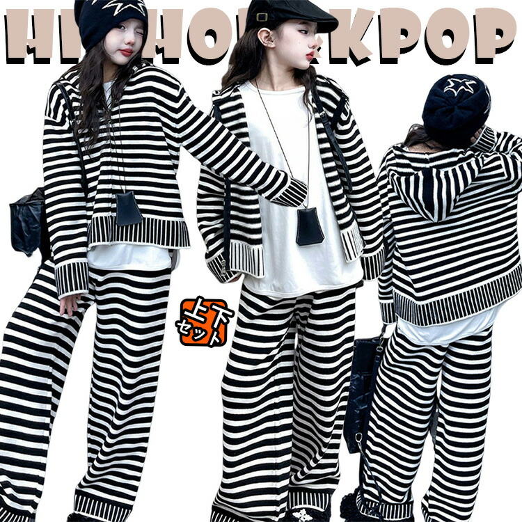 韓国 ストライプ柄 ブラック ジャケット ウェストパンツ 白 シャツ キッズ ダンス衣装 セットアップ 上下セット おしゃれ 女の子 かっこいい かわいい へそ出し ダンスウエア