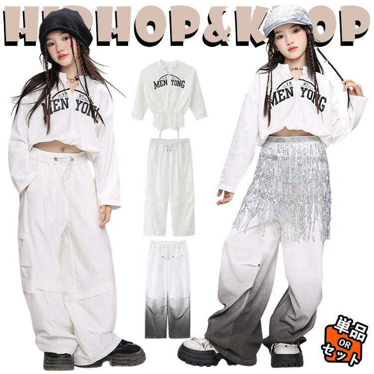 ホワイト 長袖 トップス カーゴパンツ ベルト キッズ ダンス衣装 セットアップ 上下セット おしゃれ 韓国 女の子 かっこいい かわいい へそ出し ウェストパンツ ダンスウエア ヒ
