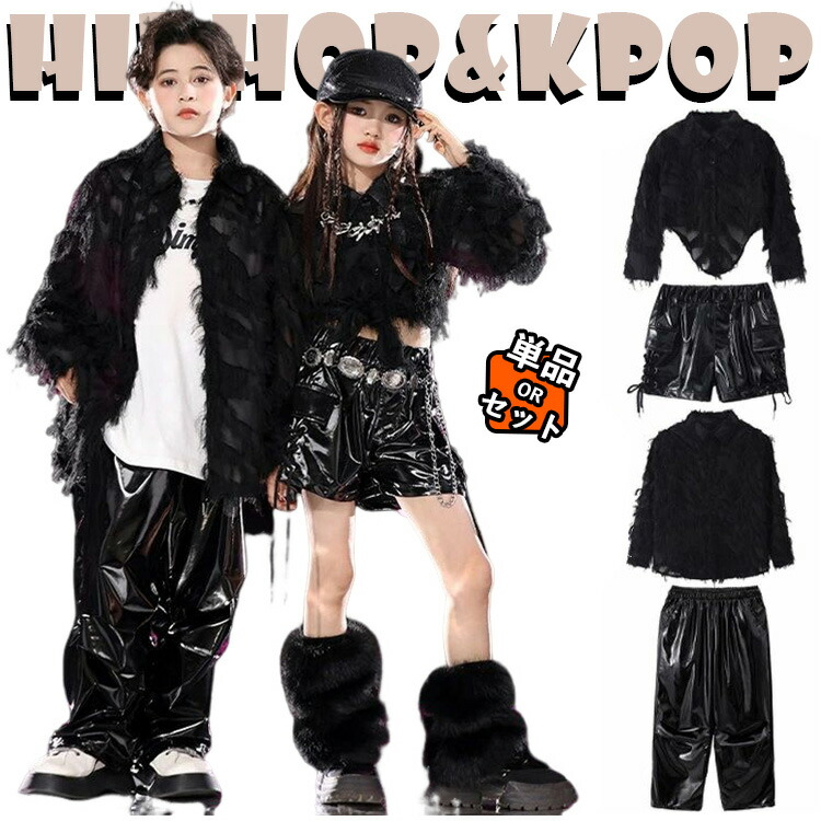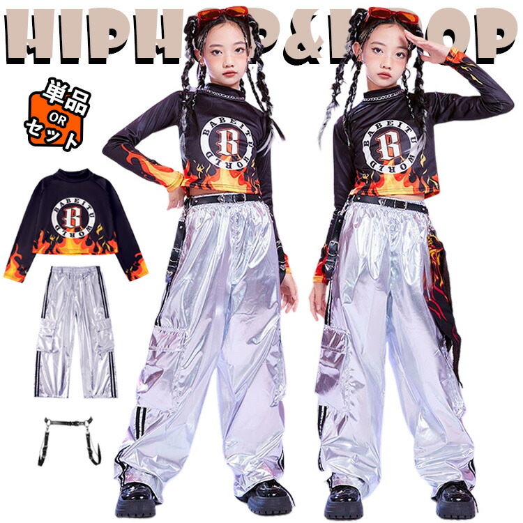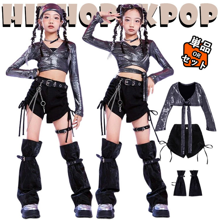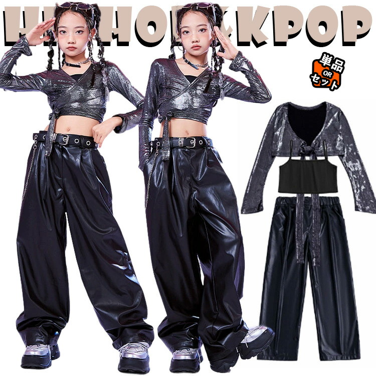 長袖 黒 トップス シルバー レザー カーゴパンツ ベルト 韓国 jazz キッズ ダンス衣装 セットアップ 上下セット おしゃれ 女の子 かっこいい かわいい へそ出し ファション ダンスウ