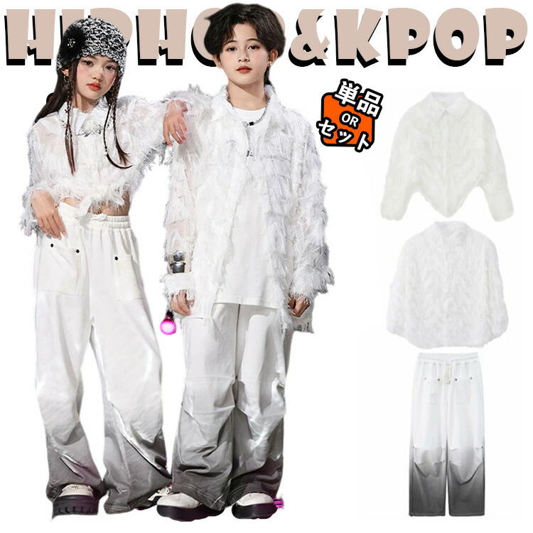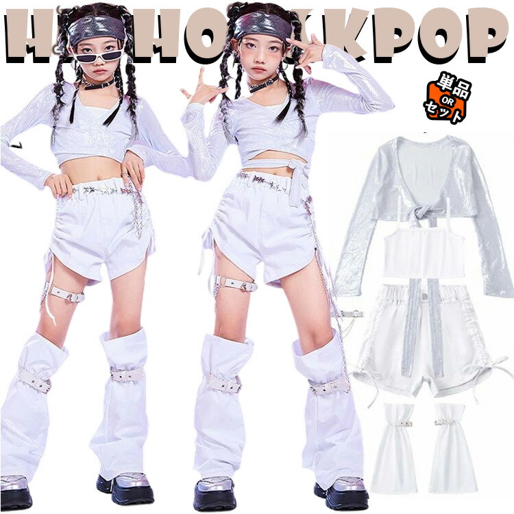 ホワイト 長袖 トップス カーゴパンツ ベルト キッズ ダンス衣装 セットアップ 上下セット おしゃれ 韓国 jazz 女の子 かっこいい かわいい へそ出し ウェストパンツ ダンスウエア ヒ
