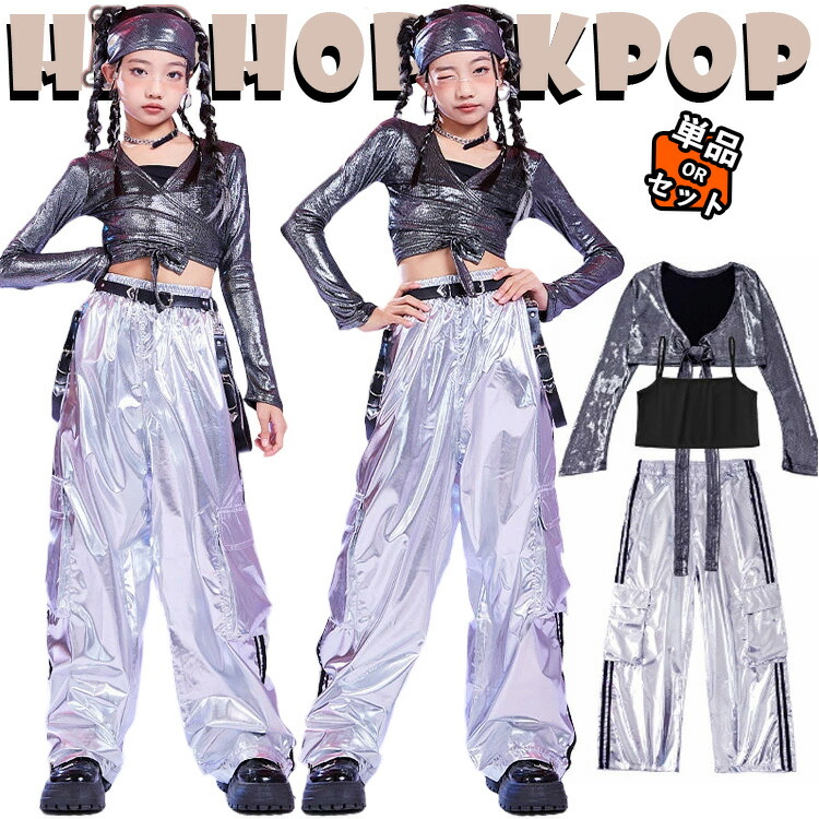 キッズ ダンス衣装 セットアップ 韓国 k-pop チア 女の子 チアガール おしゃれ 長袖 ショート丈 へそ出し トップス シルバー カーゴパンツ ジャズダンス ヒップホップ ギャル系 発表