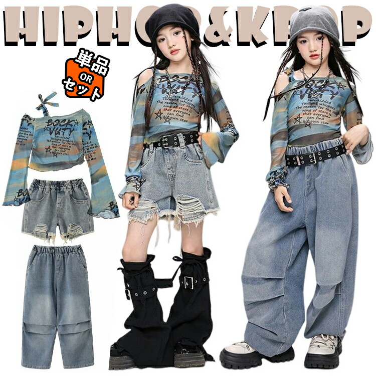 キッズ ダンス衣装 セットアップ 女の子 チア チアガール 長袖 ライナー へそ出し 肩だし ショート丈トップス トップス hiphop デニムパンツ ショート丈 韓国 k-pop ジャズダンス ヒ