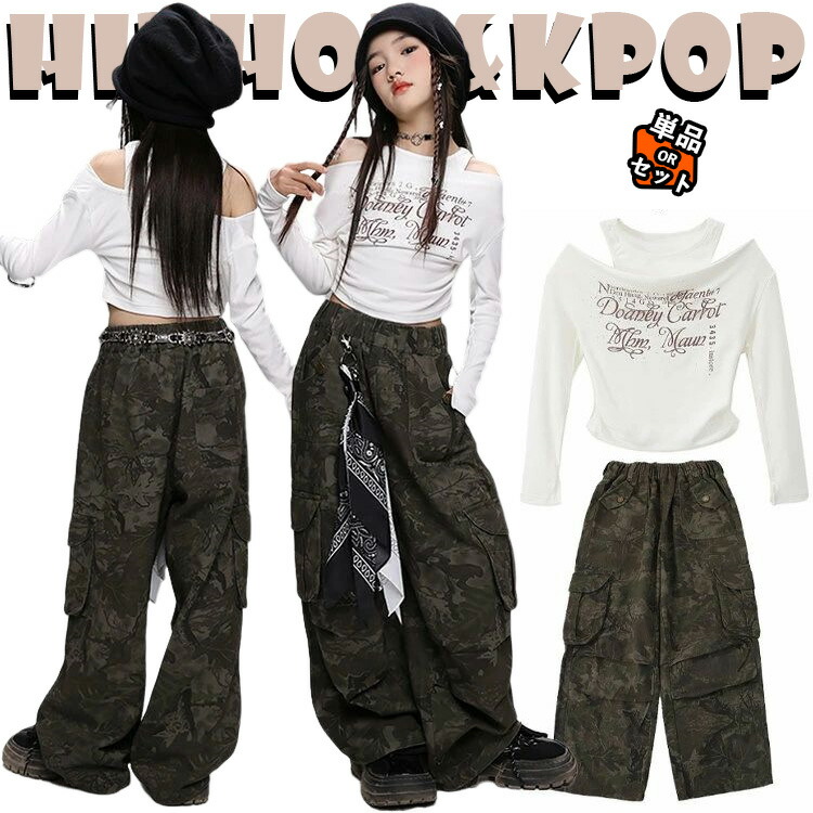 キッズ ダンス衣装 セットアップ 女の子 チア チアガール 韓国 k-pop ファッション ショート丈 長袖 肩だし へそ出し トップス 迷彩柄 サルエルパンツ カーゴパンツ ヒップホップ ジ