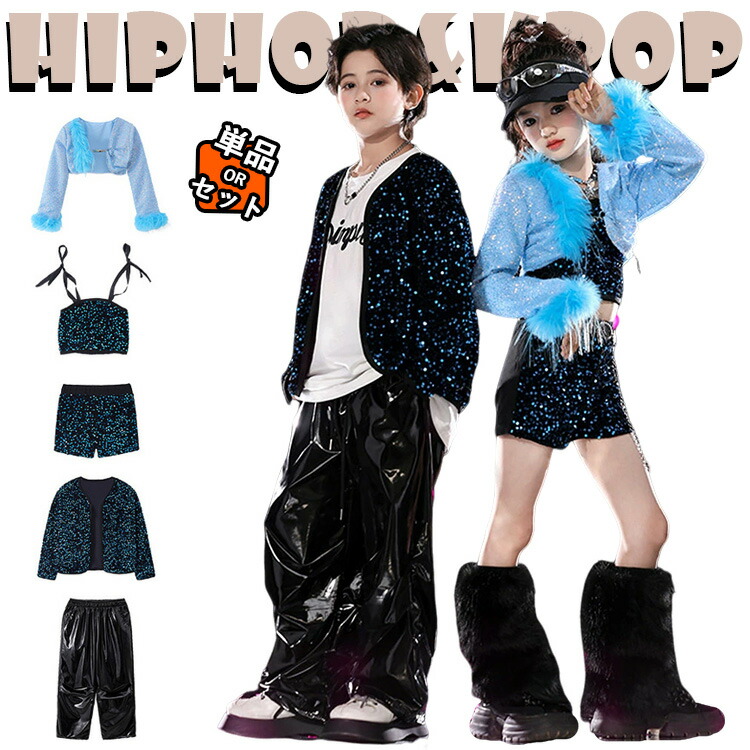 ブルー 水玉柄 スパンコール キッズ ダンス衣装 セットアップ 女の子 男の子 黒色 シャツ ダンスウェア トップス ショート丈 パンツ カーゴパンツ ジャズダンス ヒップホップ 韓国 -