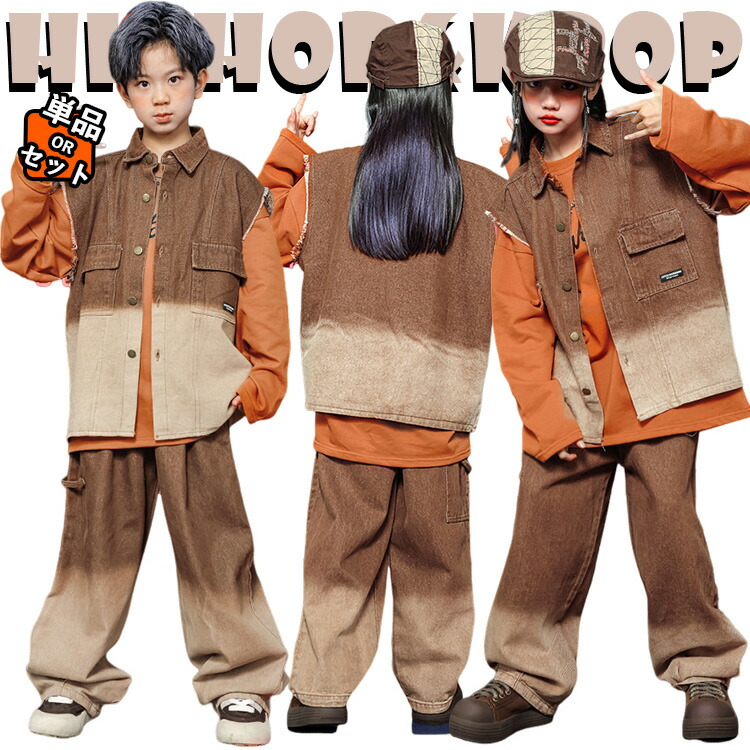 デニム ブラウン キッズ ダンス衣装 女の子 男の子 長袖 ベスト カーゴパンツ トップス パンツ セットアップ カジュアル かっこいい ダンスウェア ヒップホップ ジャズダンス ポッピ