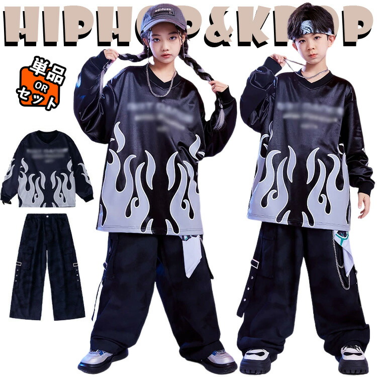 キッズ ダンス衣装 ブラック トップス カーゴパンツ レーシング風 セットアップ 上下セット おしゃれ 女の子 男の子 かっこいい かわいい 長袖 シャツ ゆったり ダンスウエア ヒップ