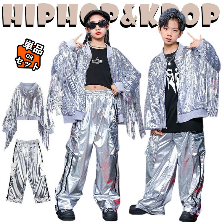シルバー ジャケット カーゴパンツ キッズ ダンス衣装 セットアップ 上下セット おしゃれ 女の子 男の子 かっこいい かわいい ゆったり トップス レザーパンツ ダンスウエア ヒップホ