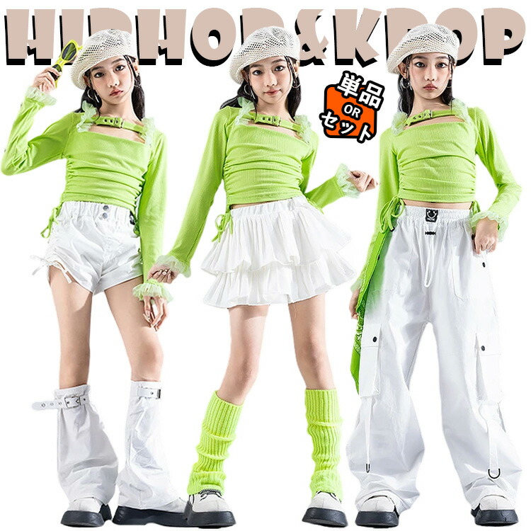 グリーン トップス 白 スカート カーゴパンツ キッズ ダンス衣装 セットアップ 上下セット 韓国 jazz おしゃれ 女の子 かっこいい かわいい 長袖 Tシャツ 短パンツ ダンスウエア ヒッ