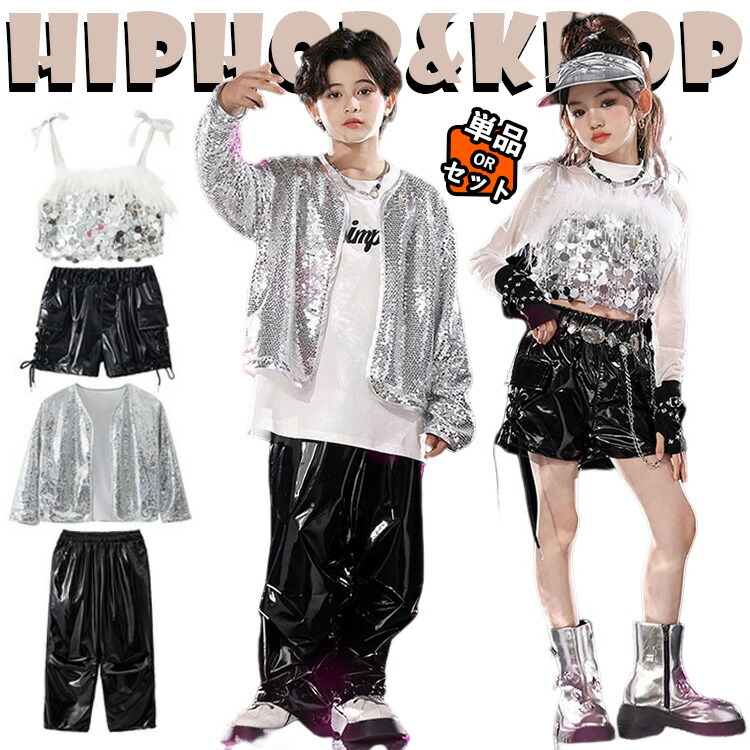 銀色系 キラキラ キャミソール カーゴパンツ シルバー PU レザー 長袖 トップス キッズ ダンス衣装 女の子 上下セット ショート丈 へそ出し セットアップ チア チアガール jazz 韓国