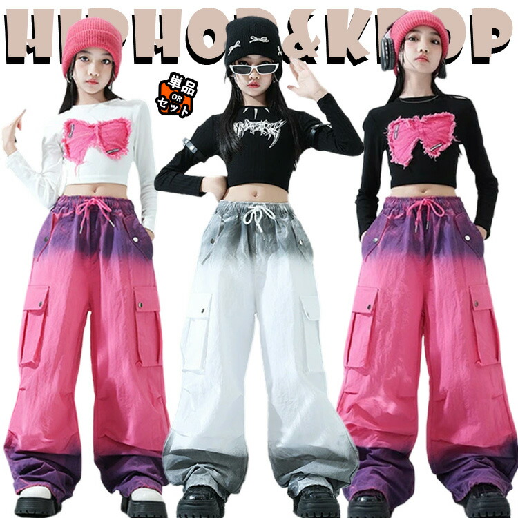 キッズ ダンス衣装 女の子 上下セット グラデーション加工 長袖 トップス カーゴパンツ 長袖 へそ出し ワイドパンツ ゆったり 無地 チア チアガール 韓国 - ヒッ