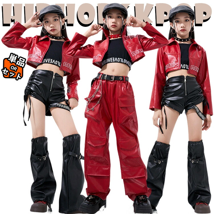 レッド 赤 PU レザー ジャケット ショート丈 へそ出し カーゴパンツ セットアップ キッズ ダンス衣装 女の子 jazz チア チアガール タンクトップ 短パン 長袖 韓国 k-pop HIPHO