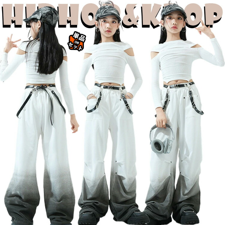 jazz 韓国 k-pop キッズ ダンス衣装 女の子 上下セット 白 ワイドパンツ 肩出し 長袖 トップス ショート丈 へそ出し カーゴパンツ ベルト チア チアガール グラデーションカラー セッ