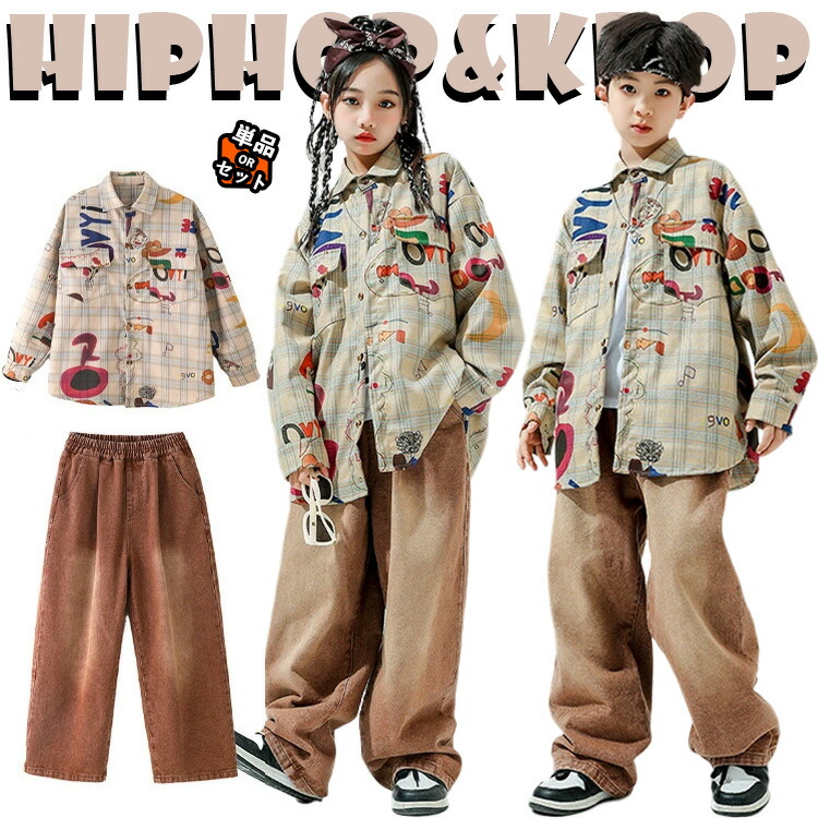 キッズ ダンス衣装 女の子 男の子 上下セット 長袖シャツ デニムパンツ ワイドパンツ チェック柄 半袖 シャツ ゆったり 柄シャツ セットアップ 韓国 - ヒップホ