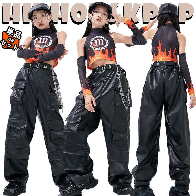 ブラック PU レザー カーゴパンツ ショートトップ 上下セット キッズ ダンス衣装 女の子 jazz チア チアガール レザーパンツ 腕カバー ショート丈 肩出し へそ出し セットアップ 韓国