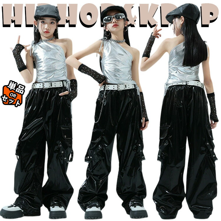 jazz 韓国 k-pop シルバー ショートトップ PU レザー カーゴパンツ キッズ ダンス衣装 女の子 レザーパンツ 腕カバー タンクトップ へそ出し 肩出し HIPHOP ヒップホップ 子供服