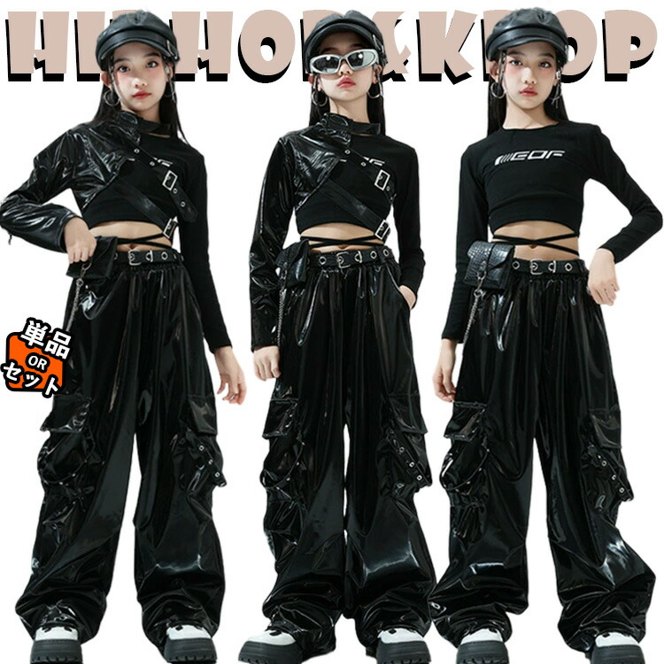 韓国 k-pop キッズ ダンス衣装 黒色系 PU レザー カーゴパンツ ジャケット jazz 女の子 上下セット 長袖 トップス ショート丈 へそ出し かっこいい セットアップ チア チアガール H