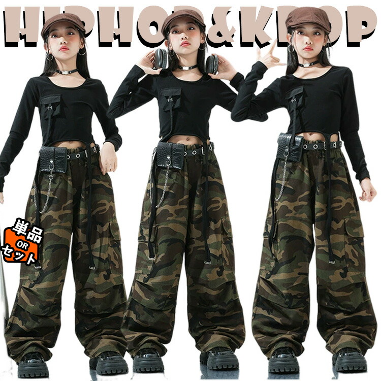 迷彩柄 キッズ ダンス衣装 jazz チア チアガール 上下セット 長袖トップス カーゴパンツ カーキグリーン 黒色 迷彩パンツ へそ出し 女の子 韓国 k-pop HIPHOP ヒップホップ 子供服