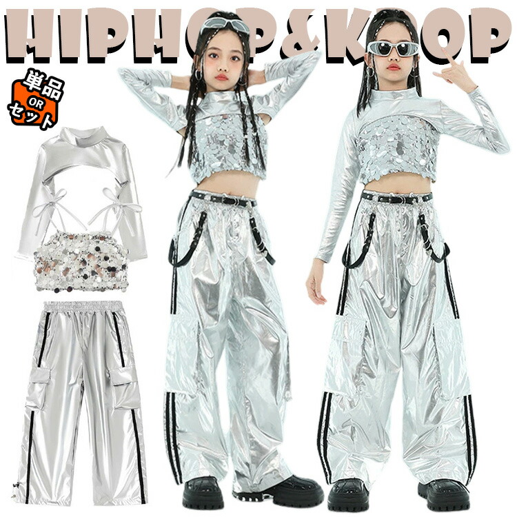 銀色系 キラキラ キャミソール カーゴパンツ シルバー レザー 長袖 トップス キッズ ダンス衣装 女の子 上下セット ショート丈 へそ出し セットアップ チア チアガール 韓国