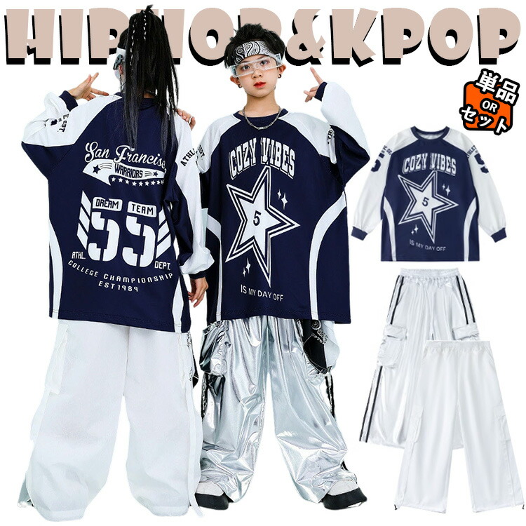 カジュアル ゆったり シルバー キッズ ダンス衣装 女の子 男の子 上下セット カーゴパンツ トップス ワイドパンツ 総柄 セットアップ 韓国 k-pop HIPHOP jazz ヒップホップ 子供服