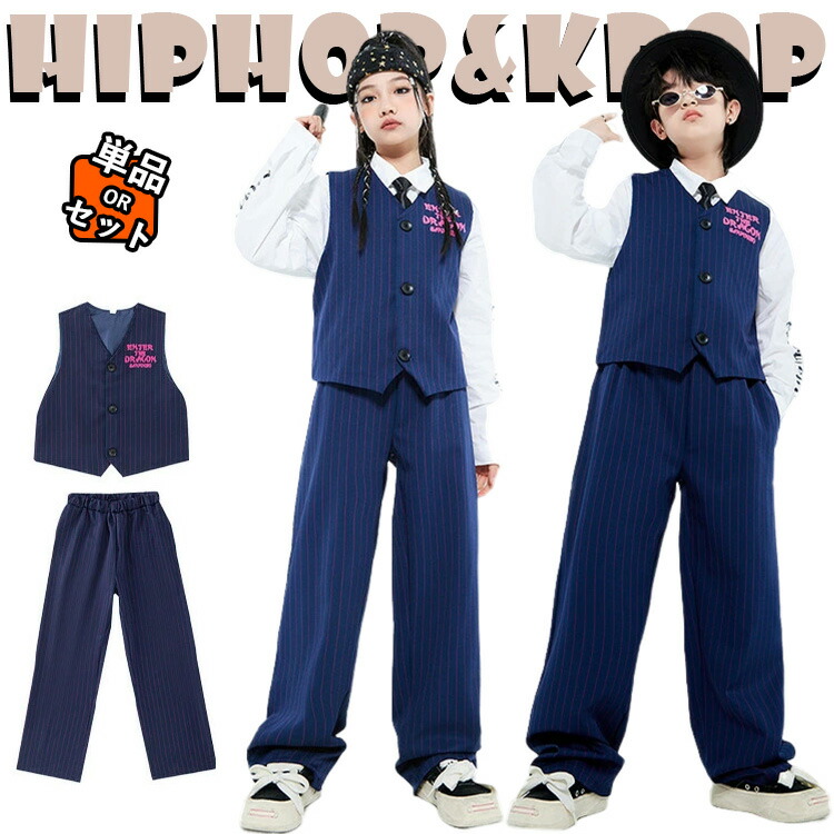 キッズ ダンス衣装 セットアップ 紺色 ベスト パンツ 白シャツ パンツスーツ 韓国 K-POP HIPHOP 単品販売 長袖シャツ 女の子 男の子 パフォーマンス服 子供服 演出服 団体服 発表会